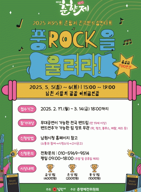 남원시에 따르면 전국에서 122팀이 신청했으며, 영상심사를 통해 예선을 통과한 본선 진출 20팀이 2025.5.5. 부터 5.6. 2일간 남원 사랑의 광장 야외공연장에서 치열한 경쟁을 펼친다.