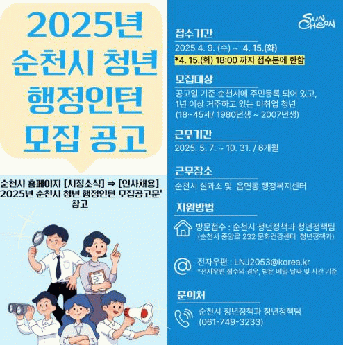 자세한 사항은 순천시청 누리집 [시정소식]에서 [인사채용]을 참고하거나, 순천시청 청년정책과 청년정책팀으로 문의하면 된다.