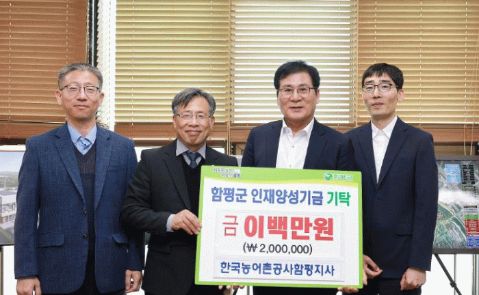 함평군은 4일 “한국농어촌공사 함평지사가 지난 3일 함평군 인재양성기금에 2백만원을 기탁했다”고 밝혔다.