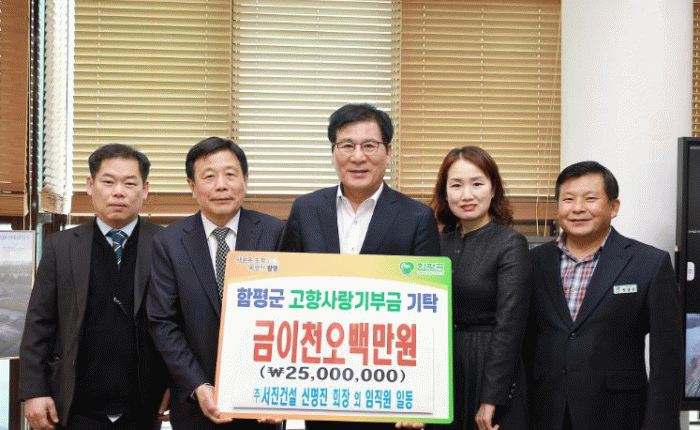 신명진 ㈜서진건설 회장은 “함평군민과 지역사회 발전에 조금이나마 보탬이 되기를 바라는 마음으로 임직원들과 함께 기부했다”며 “앞으로도 지역 사회와 함께 성장하는 기업이 되도록 노력하겠다”고 밝혔다.