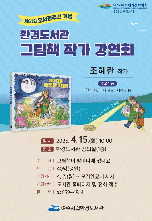 강연 참여 신청은 오는 7일부터 여수시립도서관 누리집 또는 유선으로 가능하며, 선착순 마감된다.