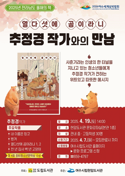 강연 참여 신청은 오는 7일부터 여수시립도서관 누리집을 통해 가능하며, 관내 중고등학생이라면 누구나 무료로 참여할 수 있다.