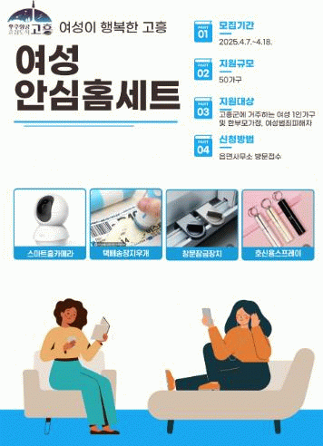 신청 대상자는 고흥군에 거주하는 여성 1인 가구, 여성이 포함된 한부모가정, 여성 범죄피해자이며, 특히 범죄 대응 능력이 취약한 여성 범죄피해자와 한부모가정을 우선적으로 지원할 계획이다.