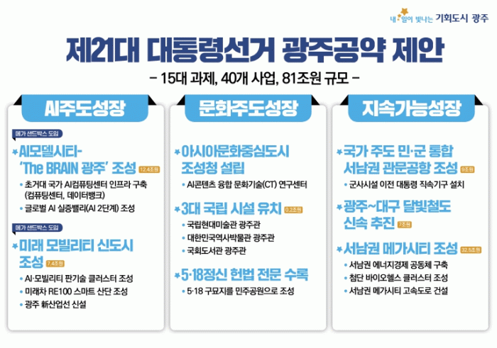 광주시가 제안한 광주공약은 지역 7대 과제, 초광역 3대 과제, 국가 5대 과제 등 15대 과제, 40개 사업, 사업비 81조원 규모로 구성됐다.
