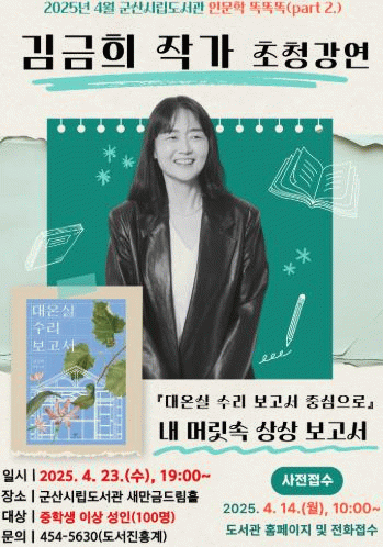 강연은 23일 오후 7시 군산시립도서관 새만금 드림홀에서 ‘내 머릿속 상상 보고서 : 대온실 수리 보고서를 중심으로’라는 주제로 진행된다.