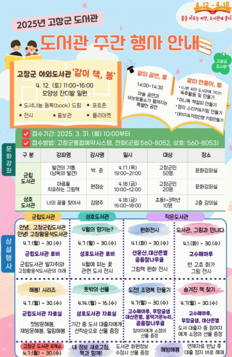 고창군도서관은 13일 2025 고창군 야외도서관 ‘같이 책, 봄’ 행사를 오전 11시부터 오후 4시까지 고창읍성 잔디광장에서 진행한다.
