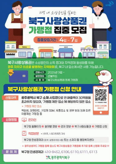 상품권 가맹점 모집에 신청하고자 하는 소상공인은 북구청 누리집에 게시된 QR코드를 인식하여 온라인 접수하거나 동 행정복지센터 또는 북구청 민생경제과에 방문하여 신청서 및 사업자등록증 등 구비서류를 제출하면 되고 기타 자세한 사항은 북구청 민생경제과로 문의하면 된다.