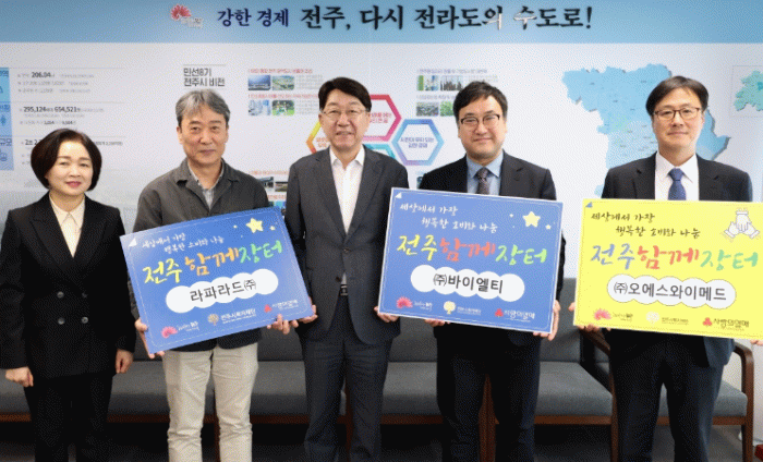 전주시는 지난 8일 △라파라드 △바이엘티 △오에스와이메드 등 전주지역 3개 바이오기업과 전주형 착한 소비자 운동인 ‘전주함께장터’ 프로젝트 성금 전달식을 가졌다.