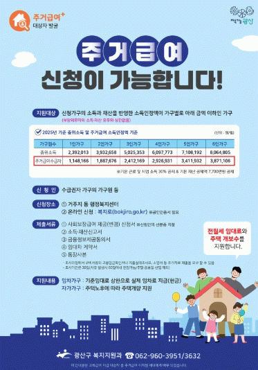 박병규 광산구청장은 “취약계층의 주거비 부담을 덜고, 안정된 생활을 할 수 있도록 최선을 다하겠다”며 “앞으로도 데이터 분석을 통해 정확한 대상자 발굴과 맞춤형 지원을 강화할 것”이라고 전했다.