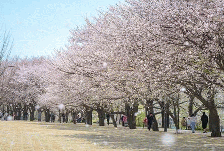 길게 나열된 벚나무 그늘 사이사이에서는 잔디가 봄 햇살을 받아 움트며 나들이객들을 반기고 있다.