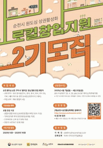 시 관계자는 “원도심 로컬 창업 지원사업은 실질적인 창업으로 이어질 수 있도록 창업지원금을 비롯하여 창업 전 과정을 촘촘히 지원하는 것이 강점”이라며 “열정과 아이디어를 가진 예비 창업자들이 순천 원도심에 새로운 활력을 불어넣는 주역이 되기를 기대한다”고 말했다.