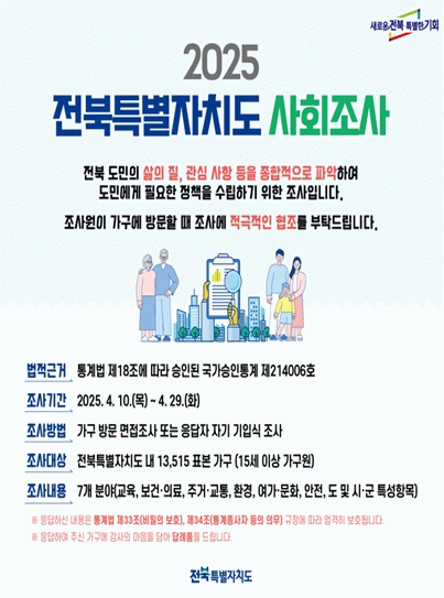 천영평 전북자치도 기획조정실장은 “도민의 삶을 정확히 이해하는 것이 곧 정책의 출발점”이라며, “조사원의 방문 시 적극적인 응답 참여를 통해, 더 나은 전북을 만들어가는 데 함께 해주시길 바란다”고 전했다.