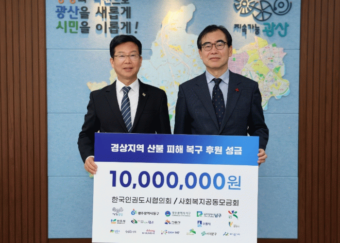 박병규 광산구청장은 “대형 산불로 인해 힘든 시간을 겪고 있는 이재민들을 위로하고, 일상 회복에 힘이 되고자 한국인권도시협의회의 뜻을 모았다”며 “경상지역 주민들의 생활 안정과 조속한 피해 복구를 위해 함께할 수 있는 노력을 이어가겠다”고 말했다.