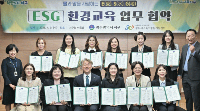 서구는 9일 김이강 서구청장과 박민희 서구육아종합지원센터장이 어린이집 대상 ‘물과 땅을 사랑하는 ESG 환경교육’ 프로그램 운영을 위한 업무협약을 체결했다.