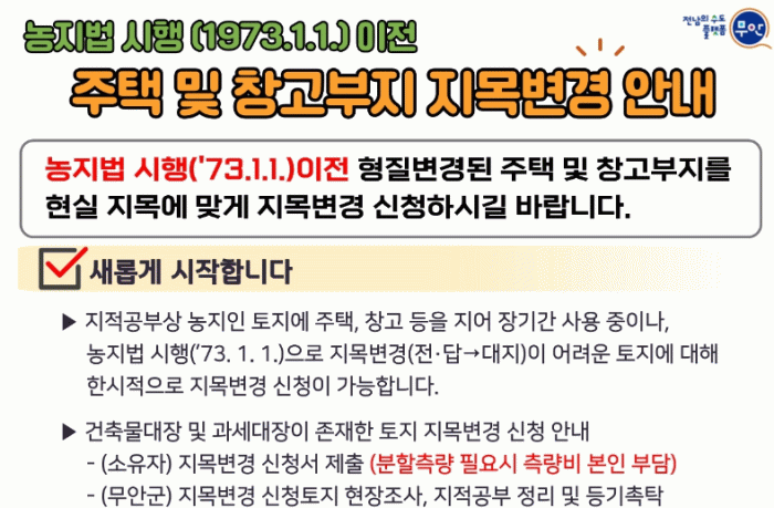 다만, 1973년 1월 농지법 시행 이전에 지어진 건축물에 한해, 실제 이용 현황에 따라 지목을 변경함으로써 토지거래 제한이나 재산권 행사에 불편을 겪는 군민들의 애로사항을 해소하고 재산권을 더욱 실질적으로 보호할 수 있을 것으로 기대된다.