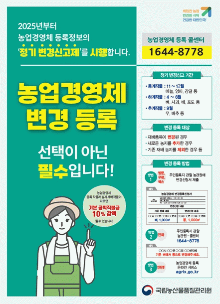 농관원 곡성・구례사무소장은 “경영체 등록정보의 정확도를 높이려면 농업인의 적극적인 참여가 필수적”이라고 하면서, “재배품목이나 농지가 변경된 농가는 이번 정기 변경 신고기간에 꼭 신고해 달라”고 당부했다.