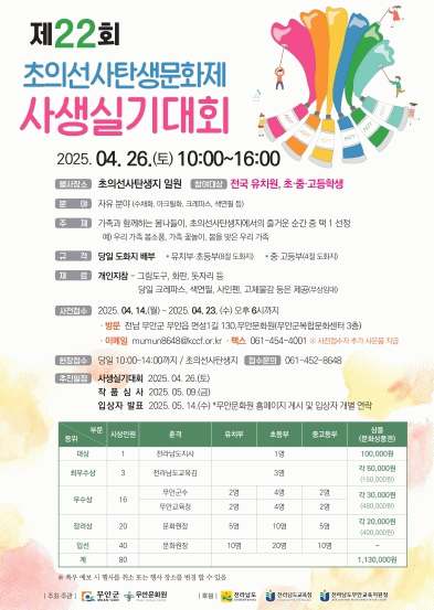 무안군이 주최하고 무안문화원이 주관하는 이번 대회는 초의선사의 문화예술에 대한 정신을 현재에 다시금 새기는 학생들이 재능을 펼칠 수 있도록 진행한다.
