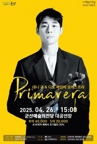 대니 구 & 디토 체임버 오케스트라의 '프리마베라'는 티켓링크에서 △R석 4만 원 △S석 2만 원에 판매하며, 16일까지는 조기 할인 20%가 진행된다.