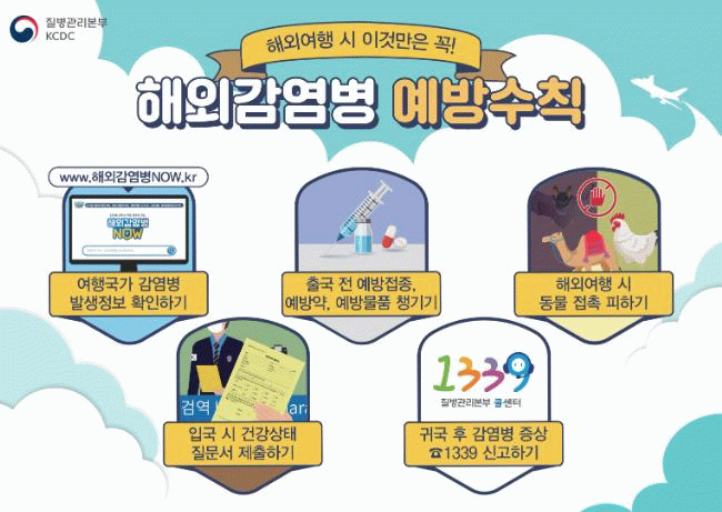 여행 전에는 ▲‘해외 감염병 NOW’에서 방문 국가 감염병 정보 확인 ▲출국 최소 2주 전 상담, 예방접종/약 받기 ▲기저질환자 건강 상태 확인 ▲비상약 준비 등을 준수해야 한다.