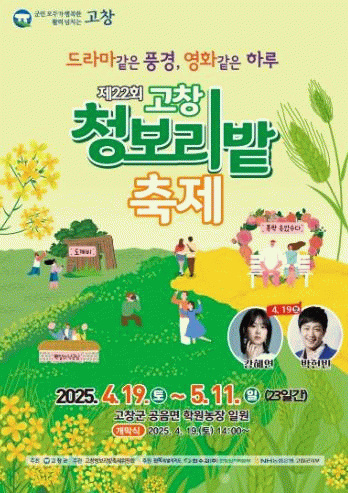 20만 여평의 광활한 대지에 K-영화와 드라마를 주제로 한 ‘제22회 고창청보리밭축제’가 이번주 토요일 4월19일부터 5월11일까지 23일간 펼쳐진다.