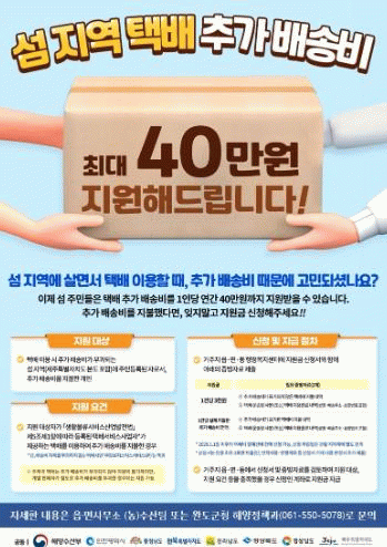 사업은 육지보다 비싼 섬 지역 택배비에 대한 주민들의 부담을 덜어주고자 추진되며, 12월 19일(예산 소진 시 종료)까지 시행한다.