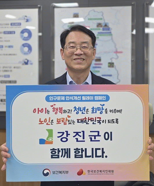 강진원 강진군수는 김성 장흥군수의 지목을 받아 이번 캠페인에 참여했다. ‘일 잘하는 강진군’이라는 슬로건 아래 청년 정착 지원, 인구 유입을 위한 정주여건 개선, 지역 일자리 창출 등 다양한 정책을 적극 추진하며 합계출산율 2년 연속 전국 2위라는 가시적인 성과를 보이고 있다.