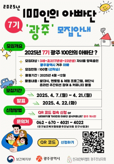 광주시가 보건복지부·인구보건복지협회 광주전남지회와 함께 모집하는 ‘100인의 아빠단’은 생애 첫 육아를 하거나 육아에 관심이 있는 초보 아빠들이 모여 육아고민과 노하우를 나누는 아빠모임으로, 지난 2019년 시작해 올해로 7기를 맞고 있다.