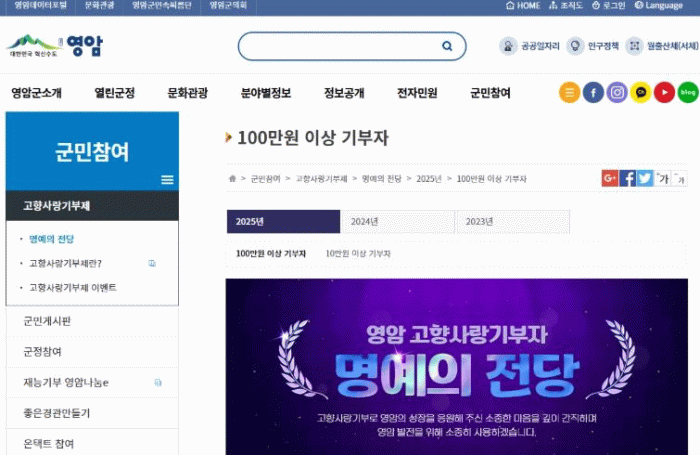 영암군홈페이지에서 ‘군민참여'고향사랑기부제'명예의 전당’의 경로로 들어가면 제도가 생긴 2023년부터 연도별로 나눠 기부자 이름을 볼 수 있다.