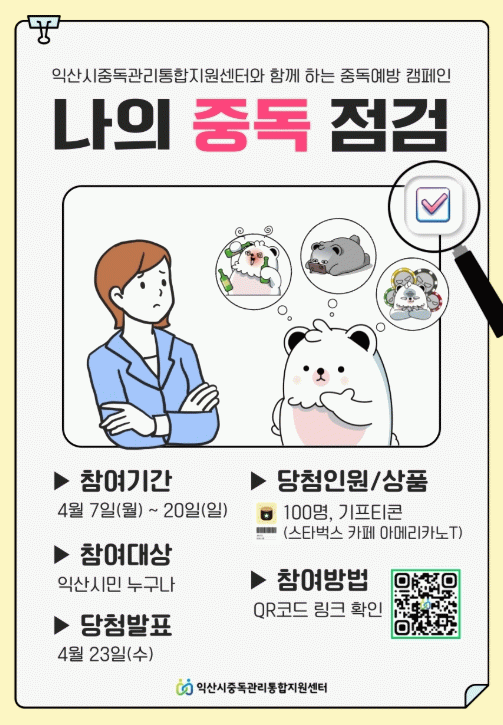 이번 캠페인은 일상에서 무심코 지나칠 수 있는 중독의 위험성을 알리고, 시민 스스로 자신의 중독 위험도를 확인할 수 있도록 마련됐다. 이를 통해 중독 폐해 없는 건강한 익산을 조성하는 것이 목표다.