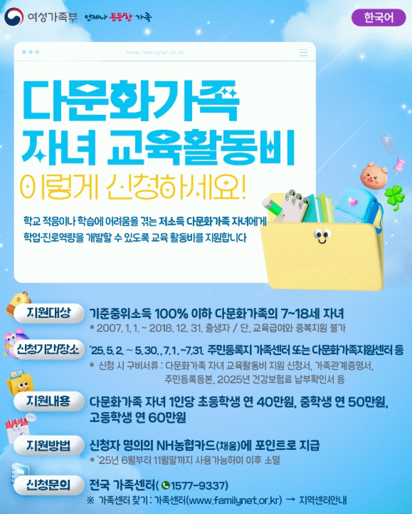 조미화 인구청년정책과장은 “이번 지원이 다문화가족 자녀들의 교육 기회 확대와 학습 의욕 향상에 실질적인 도움이 되기를 바란다”라며, “신청 기간 내 대상 가정이 빠짐없이 신청할 수 있도록 학교, 청소년 기관, 다문화 커뮤니티와 함께 적극적으로 홍보하겠다”라고 밝혔다.