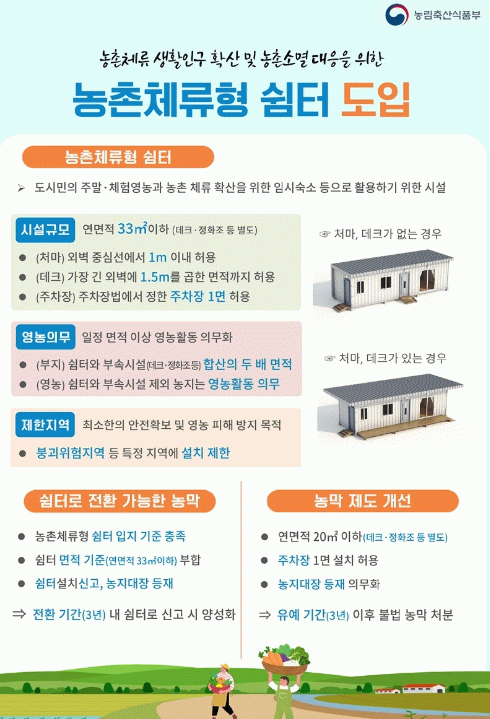 농촌체류형 쉼터는 농업인과 주말 체험 영농희망자의 편의를 돕고자 설치하는 연면적 33㎡ 이하 가설건축물 형태의 임시 숙소로, 기존 숙박이 불가능했던 농막을 대체해 농지전용 허가 없이 설치할 수 있다.