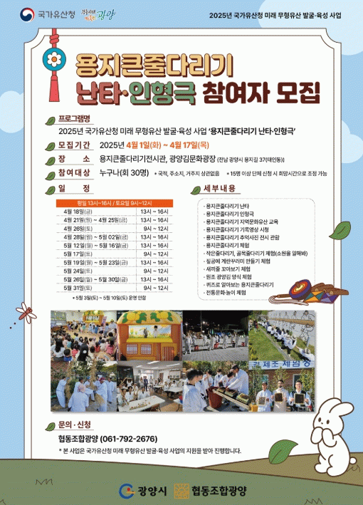 ‘미래 무형유산 발굴·육성 사업’은 전승 단절 위기에 있는 비지정 무형유산의 조사·연구, 전승 환경 조성·체계화 등을 지원·육성하는 사업으로, 광양시는 2022년부터 용지큰줄다리기를 대상으로 국가유산청 공모에 선정돼 사업을 추진하고 있다.