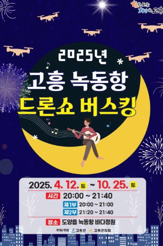 한편, 고흥군은 ‘2025 녹동항·고흥읍 드론쇼 버스킹’을 통해 군민들이 일상에서 다양한 공연 문화를 자연스럽게 접할 수 있는 기회를 확대해 나갈 계획이다.