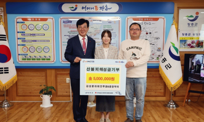 김성 장흥군수는 “실의에 빠진 이재민들에게 힘과 용기를 주신 김성훈이비인후과·중앙약국에 감사드린다. 이재민들이 하루빨리 일상으로 돌아갈 수 있기를 바란다.”고 전했다.