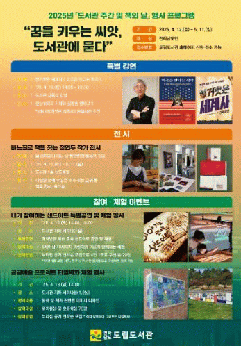 이귀동 전남도립도서관장은 “2025년 도서관 주간을 맞아 도서관에서 일상 중 문화를 향유하도록 다채로운 참여 프로그램을 준비했다”며 “앞으로도 ‘책 읽는 전남’ 문화 확산을 위해 유익한 프로그램으로 도민에게 다가가겠다”고 말했다.