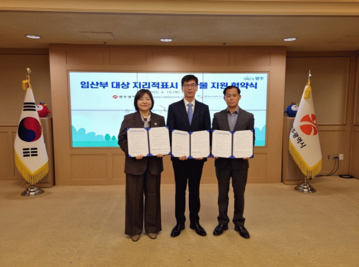 광주광역시는 10일 시청 비즈니스룸에서 이영동 여성가족국장, 이남윤 국립농산물품질관리원 전남지원장, 김경례 광주여성가족재단 대표가 참석한 가운데 ‘임산부 대상 지리적표시 농산물 지원사업 업무협약’을 체결했다.