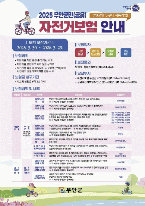 자전거 보험은 무안군에 주민등록을 둔 군민은 누구나 별도의 가입 절차 없이 자동으로 가입되며, 전국 어디에서든 자전거 사고 발생 시 보험 혜택을 받을 수 있다.