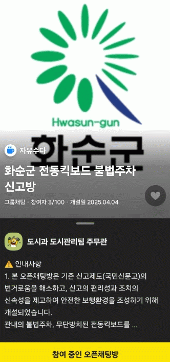 오픈채팅방은 카카오톡 오픈 채팅 서비스에서 ‘화순군 전동킥보드 불법주차 신고방’을 검색하거나, QR코드를 스캔하여 입장할 수 있으며 ▲차도 ▲보도 중앙 ▲점자블록 ▲횡단보도 위 ▲교차로 가장자리 등에 대상 물건이 주차되어 있을 시 △발견 일시 △위치 △현장 사진 등을 입력하고 신고하면 된다.