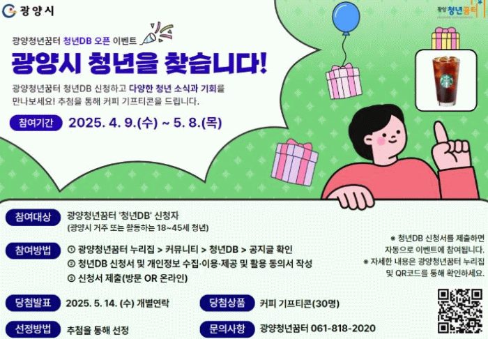 4월 9일부터 30일간 광양청년꿈터 홈페이지 내 ‘청년 DB’를 신청하면 자동으로 응모되며, 추첨을 통해 30명에게 커피 기프티콘을 증정할 계획이다.