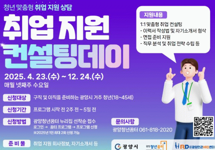 오영숙 광양청년꿈터 센터장은 “실질적인 피드백과 맞춤형 조언을 제공하는 것은 양질의 구직 정보를 제공하는 것 못지않게 중요하다”며 “청년들께서는 ‘취업 지원 컨설팅 데이’를 통해 구체적이고 실용적인 취업 전략을 수립해보시길 바란다”고 말했다.