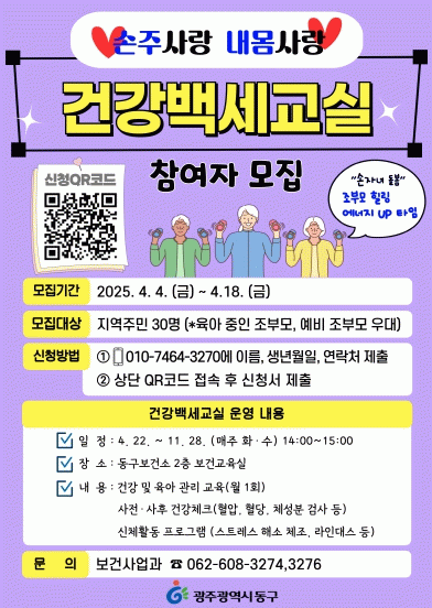 참여를 원하는 구민은 오는 18일까지 QR코드 또는 문자로 접수하면 되며 자세한 문의는 보건사업과 보건생활팀로 하면 된다.