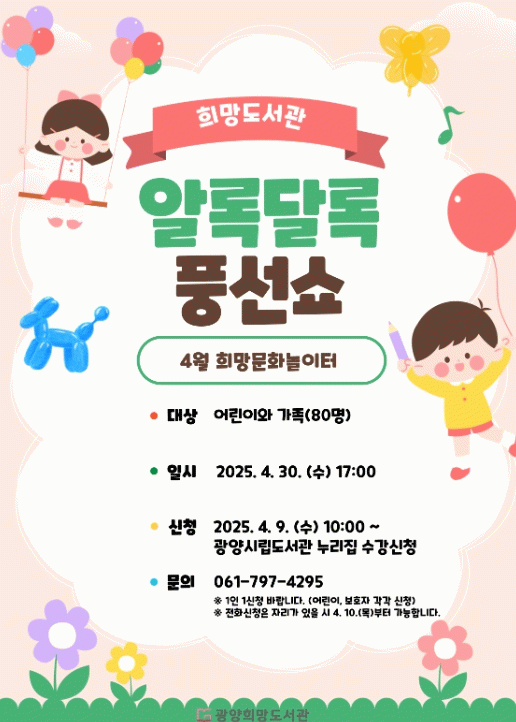 행사와 관련해 자세한 사항은 광양시립도서관 누리집의 ‘문화행사 안내’에 안내돼 있으며, 궁금한 점은 광양희망도서관으로 문의하면 된다.