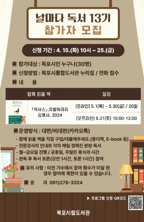 참가 신청은 4월 15일 오전 10시부터 목포시통합도서관 누리집에서 가능하며, 자세한 사항은 목포시립도서관 사서팀으로 문의하면 된다.