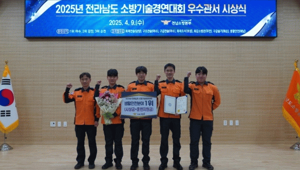 이번 대회에 생활안전분야 해남 대표로 출전한 소방교 김경수, 소방교 민성우, 소방사 송호성은 정확한 기술과 팀워크를 앞세워 빠른 시연에 성공, 최종 1위의 영예를 안았다.