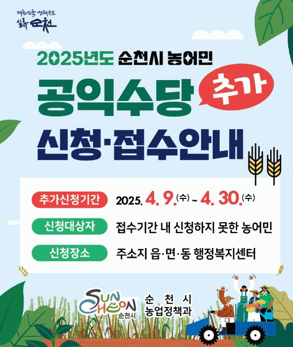 시 관계자는 “민생안정 차원에서 올해 농어민 공익수당을 조기 지급해 영농 준비와 농어촌 경제 활성화에 기여할 것으로 기대한다”며 “이번이 올해 마지막 추가 신청인 만큼, 해당 농어민께서는 반드시 기간 내 신청해 주시기 바란다”고 말했다.