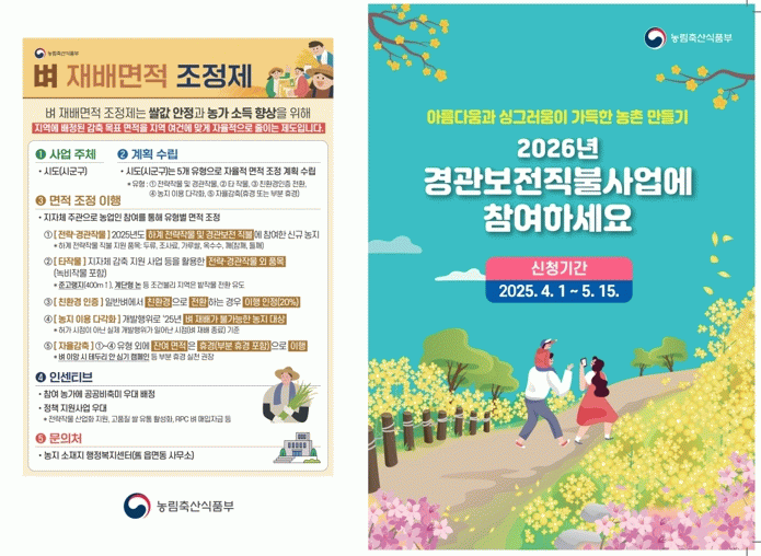 김현미 전남도 농업정책과장은 “경관보전직불제가 농촌 경관 가치를 높이고, 농업인 소득 증대에 기여하길 기대한다”며 “신청 자격을 갖춘 농업인 및 법인의 적극적인 참여 바란다”고 말했다.