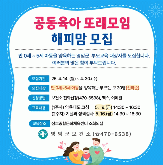 공동육아 또래 모임 해피맘에는 0~5세 자녀를 둔 엄마나 아빠 30명이 선착순으로 참여할 수 있고, 신청은 영암군보건소 전화로 하면 된다.