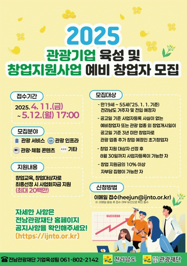 모집 대상은 19세부터 55세 이하(2025년 1월 1일 기준)의 전남 거주자나 전입 예정자로, 공고일 현재 사업자등록이 없는 예비창업자나 창업 3년 미만의 초기창업자로서 관광업종 추가 창업 예정자다.