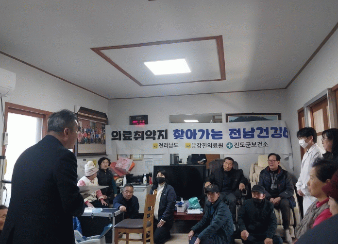 찾아가는 전남건강버스 사업은 진도군보건소 방문보건 전담팀과 강진의료원 인력이 의료 접근성이 낮은 의료 취약지역 중 65세 이상 인구 비율이 높은 경로당을 방문해 순회진료 하는 사업이다.