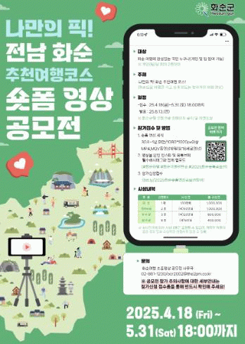 조형채 관광체육실장은 “이번 공모전을 통해 개성 있는 시각으로 화순의 관광 명소를 발굴하고, SNS를 통한 자연스러운 홍보 효과를 기대하고 있다”라며, “많은 분이 창의적인 아이디어로 화순의 아름다운 여행지를 표현해 주길 바란다”라고 전했다.